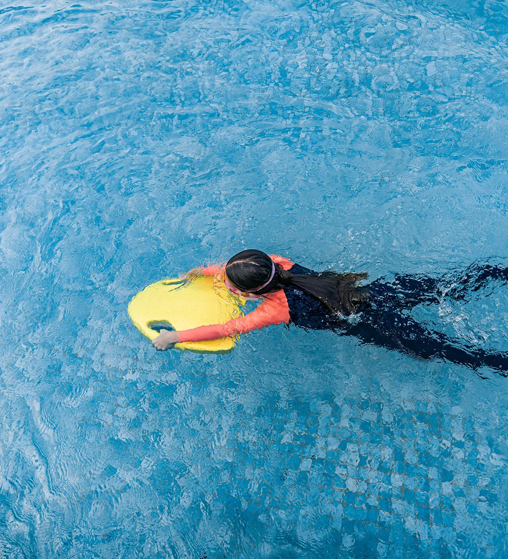 Comfortable Exploring: Arms bent, kickboard at your chest or abdomen, body resting on the board.